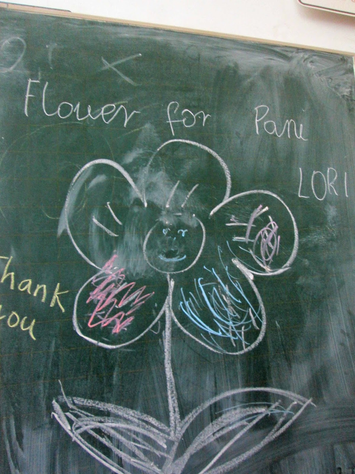 The day before the trip my 4th grade students were so excited about this trip. They asked, "Is Pani going?" Yes, Pani is going. They were so happy. And then during the break between lessons this appeared on the chalkboard in the room.